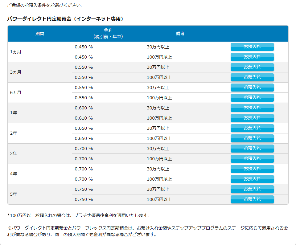 パワーダイレクト円定期預金の預入期間と金額に対する金利はこちら