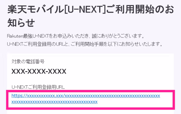 引用:楽天モバイル『Rakuten最強U-NEXT』プランを申し込んだときに来る「楽天モバイル[U-NEXT]ご利用開始のお知らせ」という件名のメールの中にある、U-NEXT登録用URLにアクセス